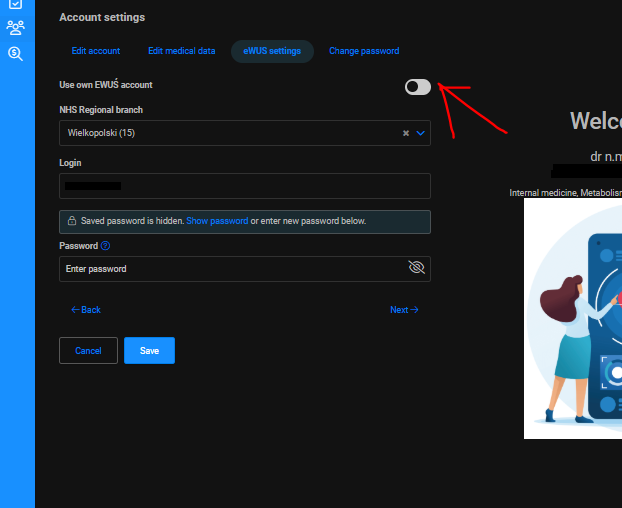 Jeżeli lekarz jest w przychodni - manager placówki może ustawić dane do autoryzacji eWUŚ. Jednak w tym przypadku lekarz również ma możliwość sam skonfigurować ustawienia eWUŚ. Wtedy dane wprowadzone przez lekarza mają wyższy priorytet i jego wizyty są sprawdzane jego eWUSiem.