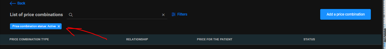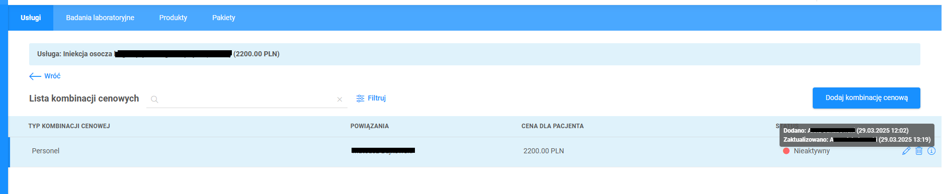 Aby rozwiązać problem, należy po przejściu w cennik Aurero https://app.aurero.com/management/system-settings/services-prices/services, po kliknięciu w przycisk kombinacje cenowe dla usługi, prosze usunąć filtr aktywne - wyświetlą się wszystkie kombinacje (które wcześniej nie były widoczne). W sytuacji, kiedy dana kombinacja cenowa ma status nieaktywny - wtedy kombinacja cenowa nie jest przesyłana z Aurero do Znany Lekarz (usługa nie jest widoczna w cenniku lekarza na Znany Lekarz). Po naniesieniu zmian w cenniku Aurero, aby usługa była uwidoczniona na Znany Lekarz, należy zapisać ustawienia lekarza (w edycji personelu, którego usług dotyczą zmiany) w integracji Znany Lekarz w zakładce https://app.aurero.com/management/integrations/docplanner/employees