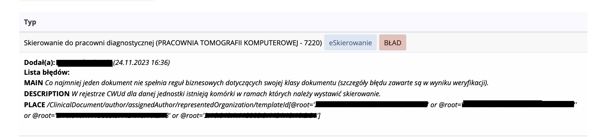11. Komunikat z błędem o treści dokument XML niezgodny z XSD występuje jeśli w chwili wystawienia skierowania, nie były wypełnione wszystkie wymagane dane pacjenta.