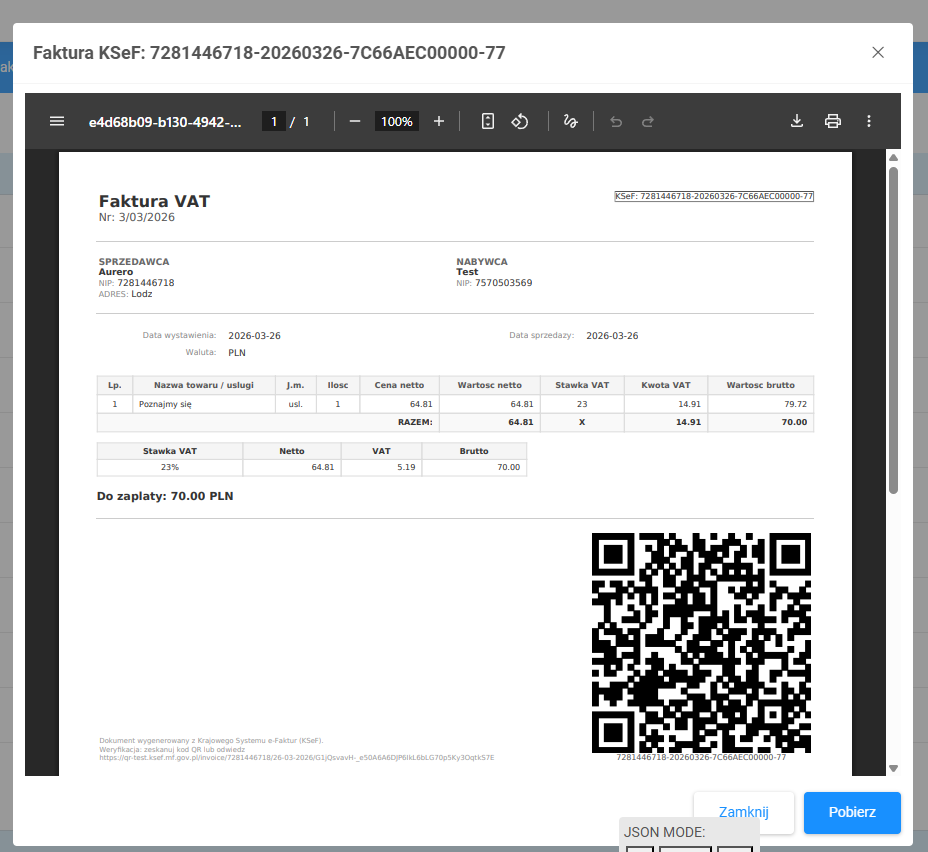 - Kod QR: Na wydruku lub PDF-ie znajduje się kod QR. Możesz go zeskanować telefonem, aby sprawdzić dane faktury w rządowej bazie danych.