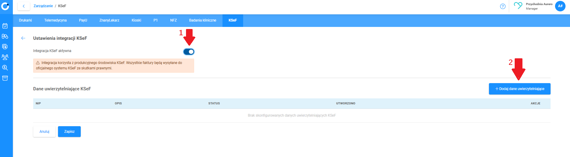 - Włączenie integracji: W ustawieniach aplikacji przejdź do zakładki Integracje - KSeF https://app.aurero.com/management/integrations/ksef